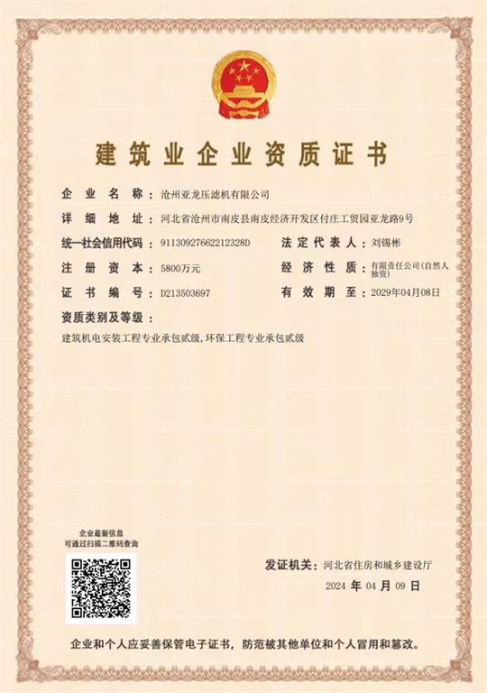 亞龍壓濾機順利通過建筑業企業資質證書